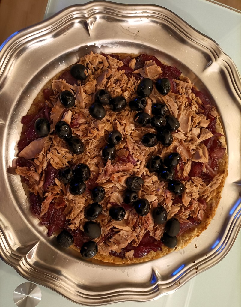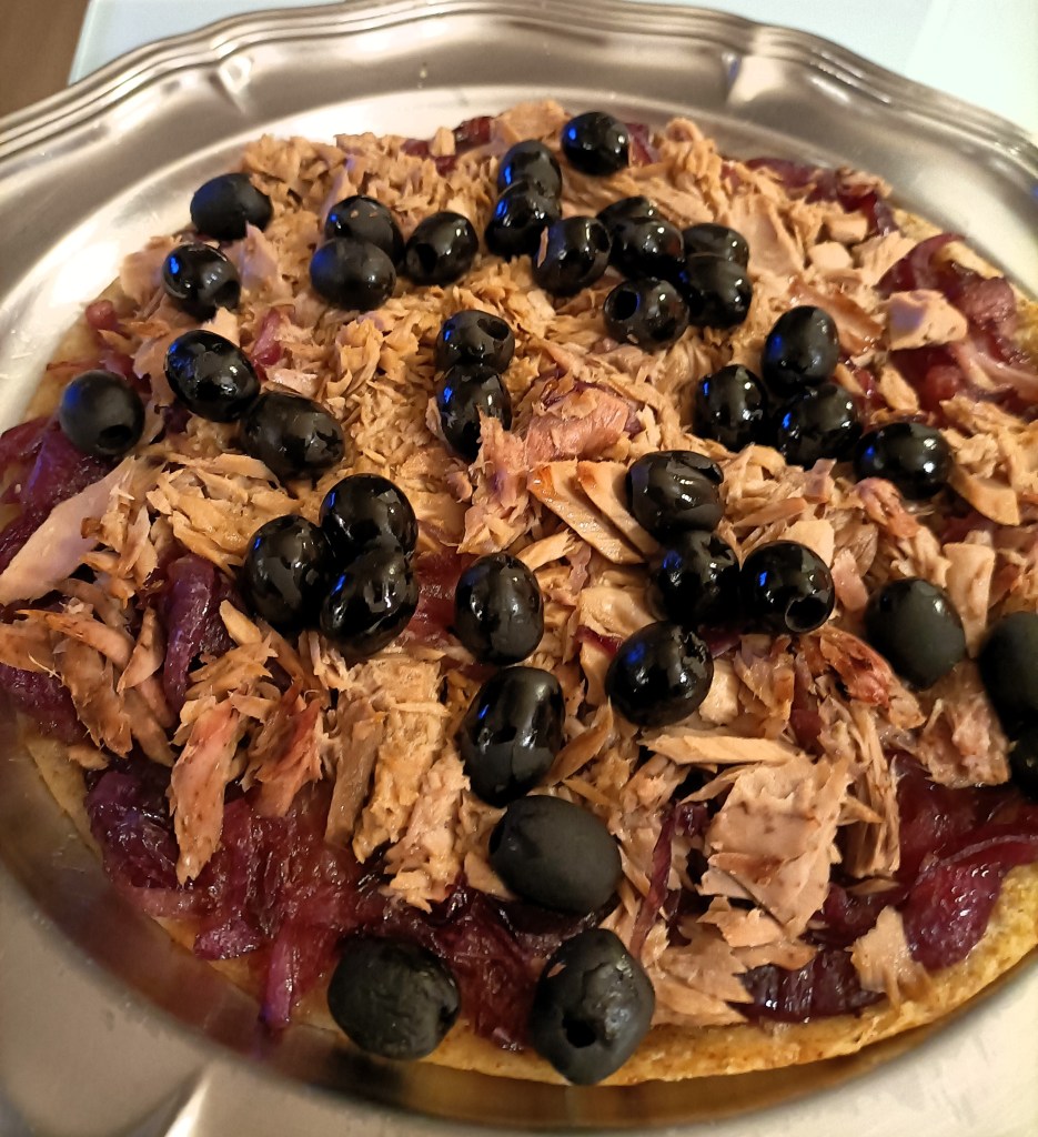 In un’altra padella scaldate la piadina in entrambi i lati. Versate le cipolle e distribuitele su tutta la superficie. Dopo aver scolato ben bene il tonno, sbriciolatelo e aggiungetelo distribuendolo sopra alle cipolle. Attendete un paio di minuti collocando alcune olive a guarnire il tutto.